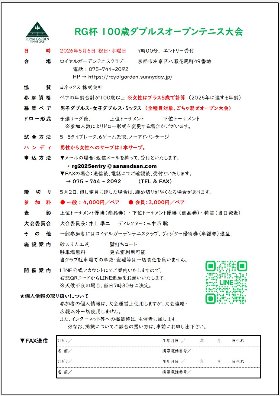 2026.5.6(祝日・水曜日)RG杯 100歳ごちゃ混ぜダブルスオープン大会 → ここをクリック